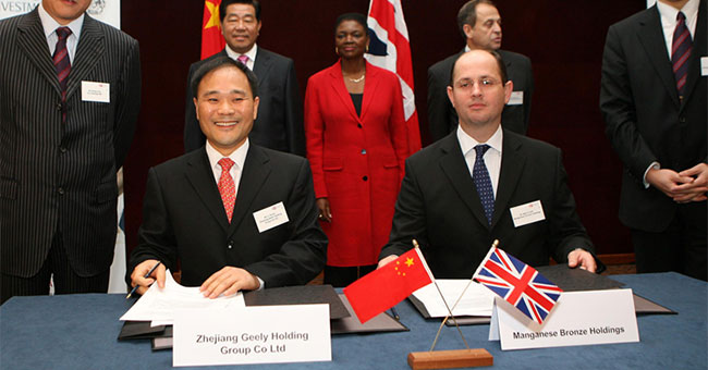 Geely Holding Group создает совместное предприятие с London Taxi International Geely Holding Group приобрела 19,97% акций Manganese Bronze Holdings (производитель и владелец классического LondonTaxi), став крупнейшим акционером компании. После приобретения акций Geely Holding Group создала совместное предприятие для производства и продажи классических лондонских такси в Китае.